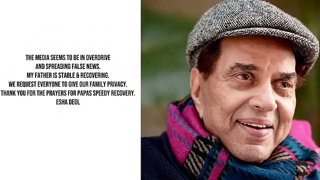 (Dharmendra) Senior actor Dharmendra's health deteriorated, and he is undergoing treatment at Breach Candy Hospital in Mumbai. However, rumors of his death spread on social media. In this context, his daughter Esha Deol has clarified. "My father is stable and his health is improving. We request everyone to respect our family's privacy. Thank you for your prayers for my father," Esha Deol posted, providing this information.
