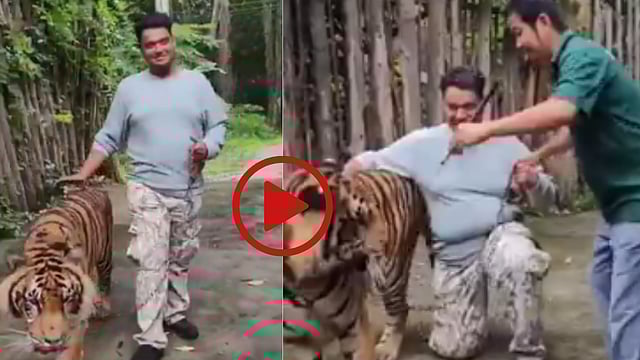In the video, a tourist can be seen walking alongside a tiger under the supervision of a park employee. Moments later, the tourist sits beside the animal to pose for a photo. Suddenly, the tiger lunges at the individual, attacking him. The man is heard screaming loudly as the attack unfolds, with the park employee rushing to intervene.